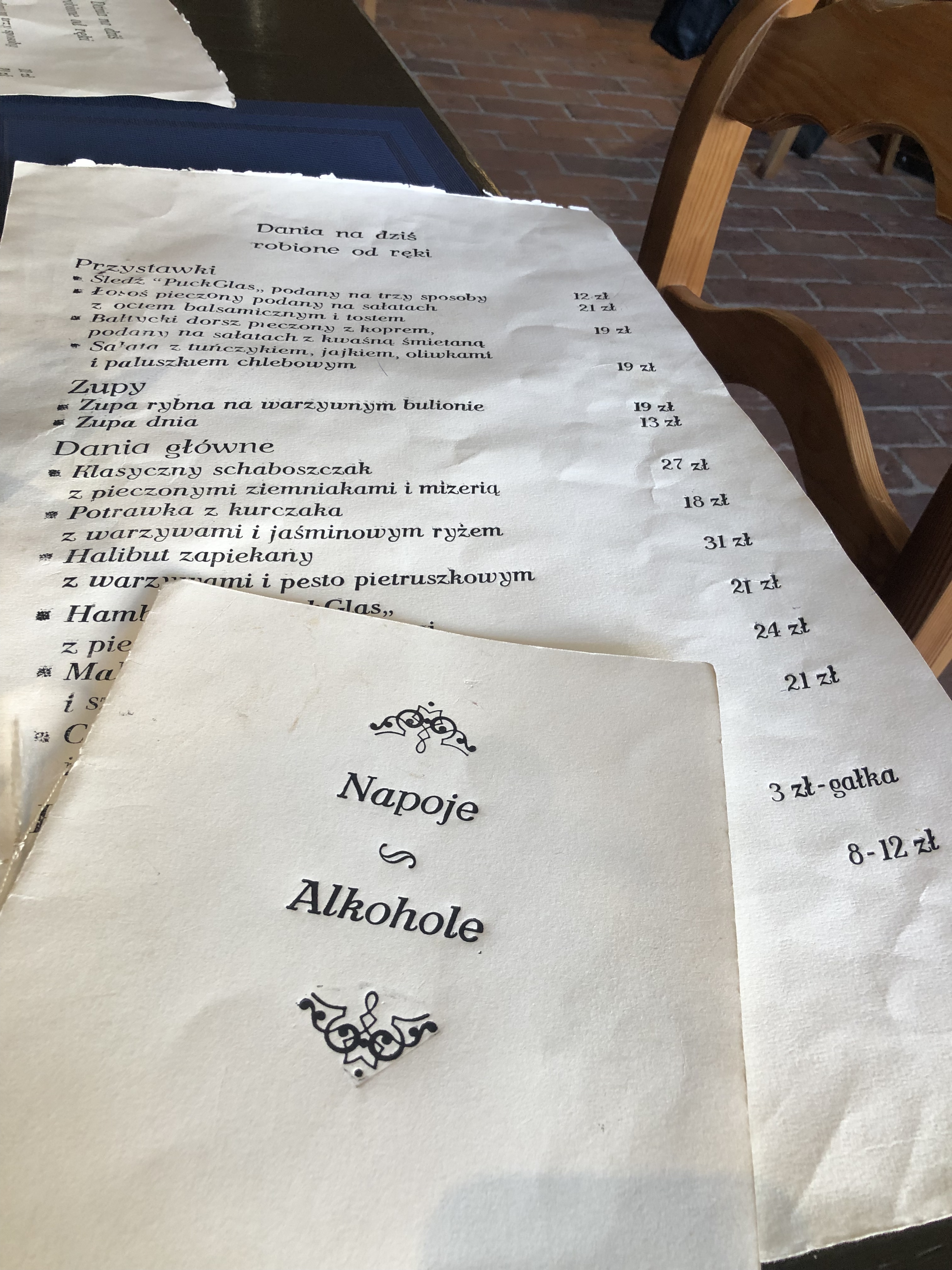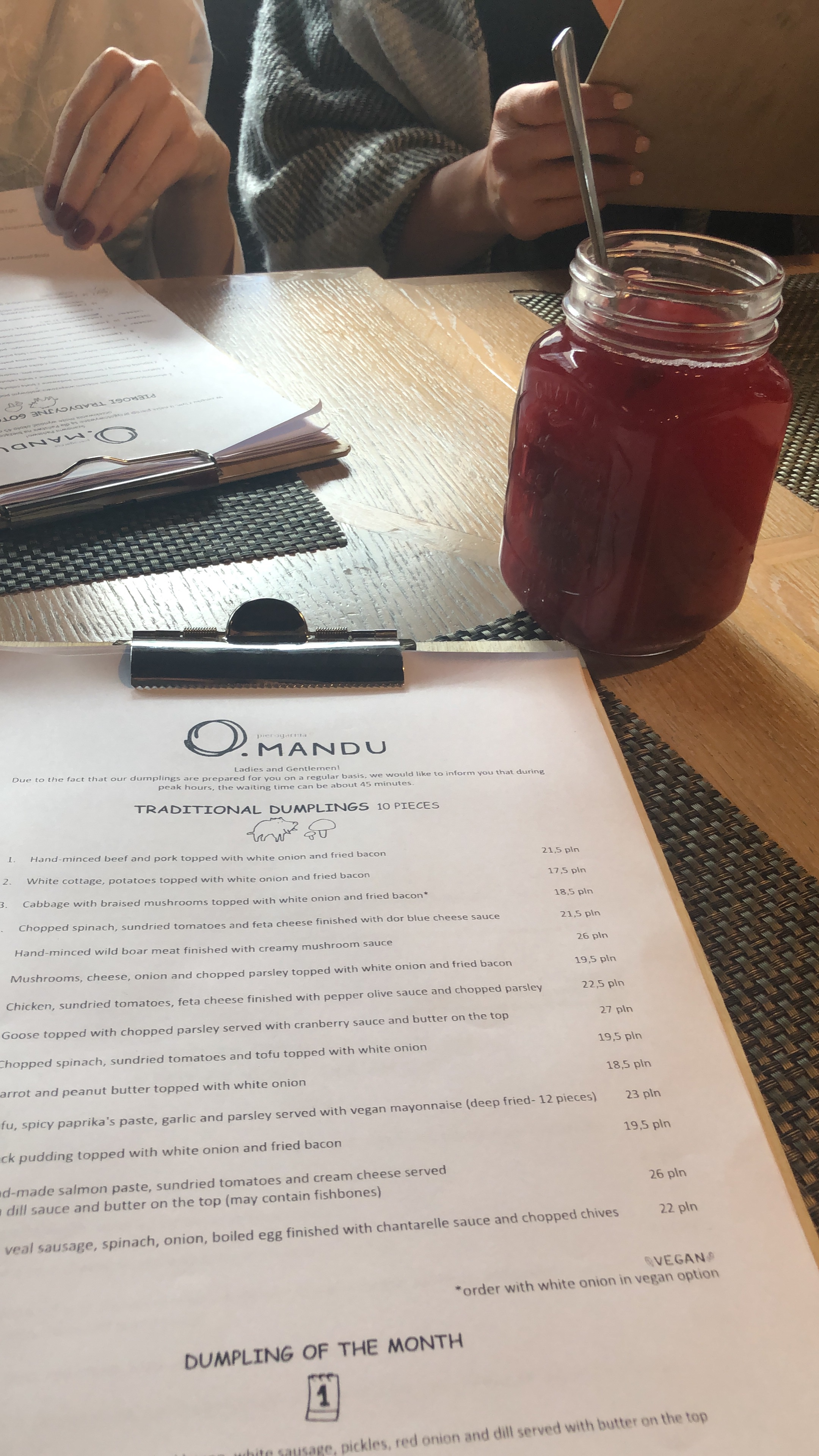 Eins der Nationalgerichte ist Pierogi, die gefüllten Teigtaschen. Und wer sie in aller Form und Variantenbreite probieren möchte, dem empfehle ich das MANDU. Das junge Restaurant mit lockerem Service und Großstadt-Ambiente verfügt auch über englische Karten (ja, mit der polnischen Sprache hab ich es leider nicht so. Ich war ausnahmsweise komplett aufgeschmissen in Wort und Schrift). Dazu gerne einen „Kompott“, wie die hausgemachte Limo in Polen heißt – nicht selten sind noch eingelegte Früchte drin. Zum Abschluss Baisertorte oder Schokokuchen- falls noch was reinpassen sollte, falls nicht, einfach am Nachbartisch probieren…man ist international in Danzig. Englisch ist kein Problem. A propos, es soll hier viele englische Second-Hand-Läden geben…Shopping-Erfolge garantiert.